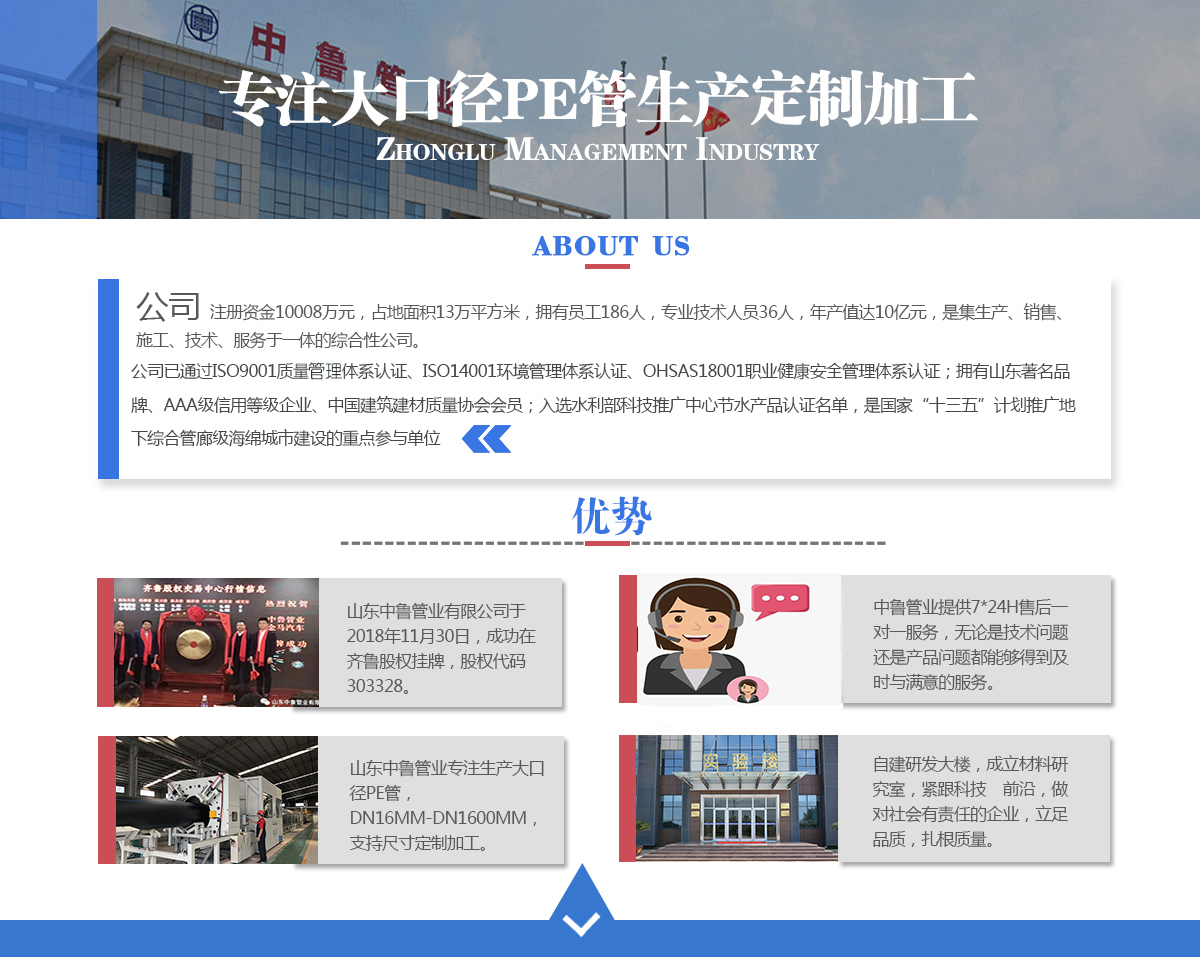 山東中魯管業有限公司 專業從事于PE給水管 PVC-U給水管 HDPE燃氣管 PPR冷熱水管 虹吸排水管 MPP電力管等 | 備案號:魯ICP備14011848號